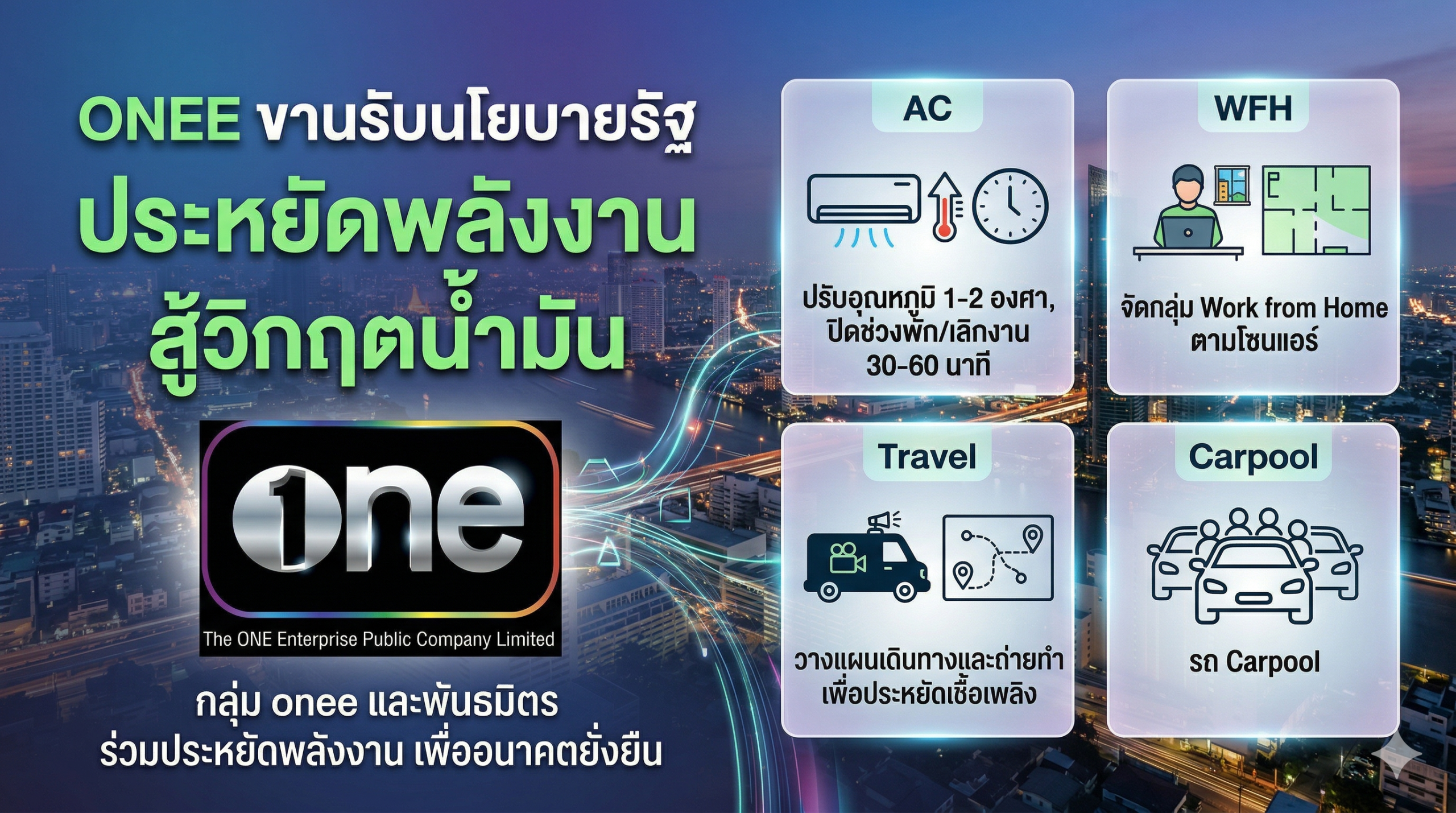 เนื่องด้วยสถานการณ์ความไม่สงบในภูมิภาคตะวันออกกลางที่ยังคงยืดเยื้อ ส่งผลกระทบต่อสถานการณ์พลังงานและต้นทุนด้านพลังงานทั่วโลก รวมถึงนโยบายของรัฐบาลที่ขอความร่วมมือให้ภาคเอกชนร่วมกันลดการใช้พลังงานเพื่อความมั่นคงทางเศรษฐกิจของประเทศ ในฐานะที่ บมจ.เดอะ วัน เอ็นเตอร์ไพรส์ (ONEE) เป็นองค์กรสื่อชั้นนำที่คำนึงถึงความรับผิดชอบต่อสังคมและสิ่งแวดล้อม บริษัทฯ จึงขอประกาศมาตรการประหยัดพลังงานเพื่อใช้ปฏิบัติร่วมกันสำหรับพนักงานในเครือ ดังนี้ : ประกาศ ที่ 1-2569 มาตรการประหยัดพลังงาน onee_signed คู่มือ Energy checklist onee